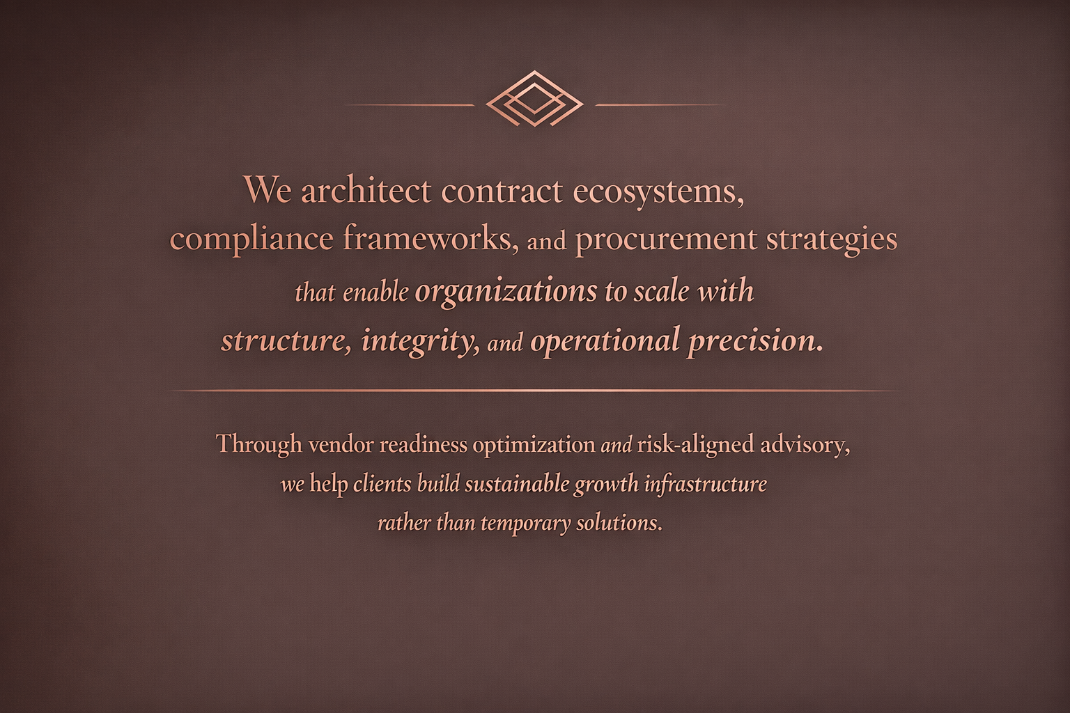 Every engagement is approached with precision, integrity, and a structured understanding of your business objectives. We ensure your contract infrastructure is sound, your vendor registrations are strategically positioned, your compliance framework is aligned with regulatory standards, and your procurement processes support disciplined sourcing and sustainable scalability.